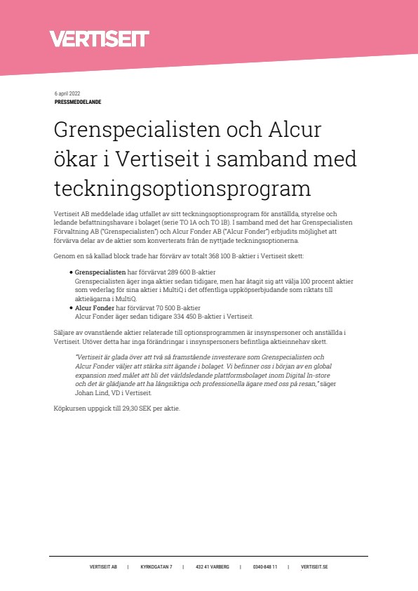 Vertiseit AB meddelade idag utfallet av sitt teckningsoptionsprogram för anställda, styrelse och ledande befattningshavare i bolaget (serie TO 1A och TO 1B). I samband med det har Grenspecialisten Förvaltning AB (“Grenspecialisten”) och Alcur Fonder AB (“Alcur Fonder”) erbjudits möjlighet att förvärva delar av de aktier som konverterats från de nyttjade teckningsoptionerna.