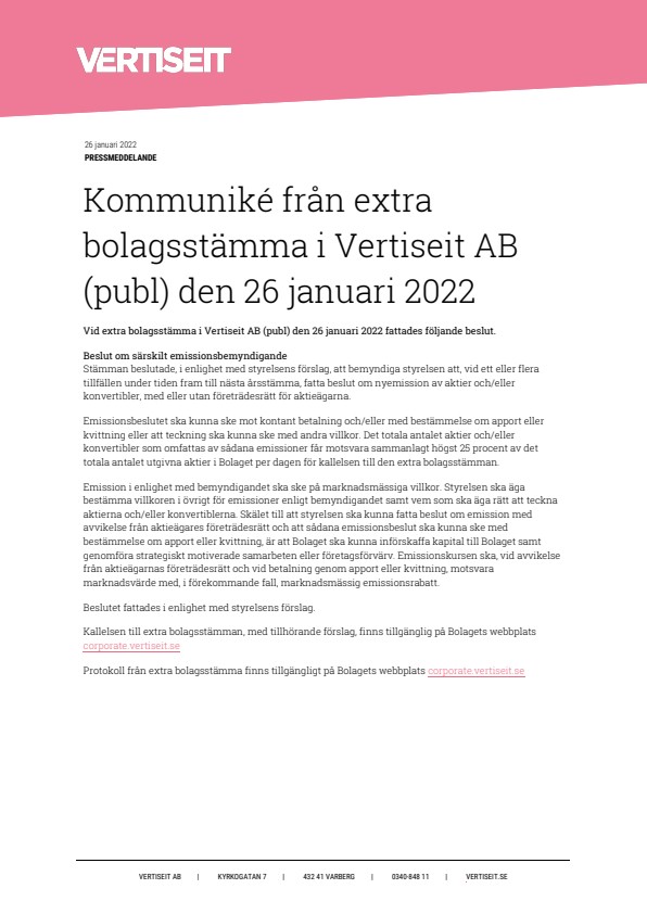 Vid extra bolagsstämma i Vertiseit AB (publ) den 26 januari 2022 fattades följande beslut.