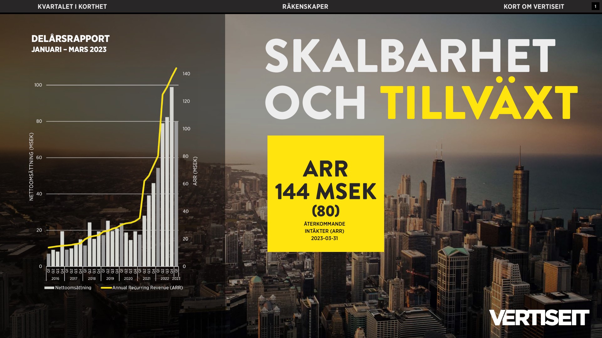 Vid utgången av det första kvartalet 2023 uppgick Vertiseits årligen återkommande intäkter (ARR) till 144 miljoner kronor, en ökning med 80 procent jämfört med föregående år. Den organiska ARR-tillväxten uppgick till 21 procent. Sekventiellt växte ARR med omkring 5 procent jämfört med föregående kvartal. Jämfört med motsvarande kvartal föregående år ökade nettoomsättningen med 47 procent till 80 miljoner kronor. Justerad EBITDA uppgick till 11 miljoner kronor.