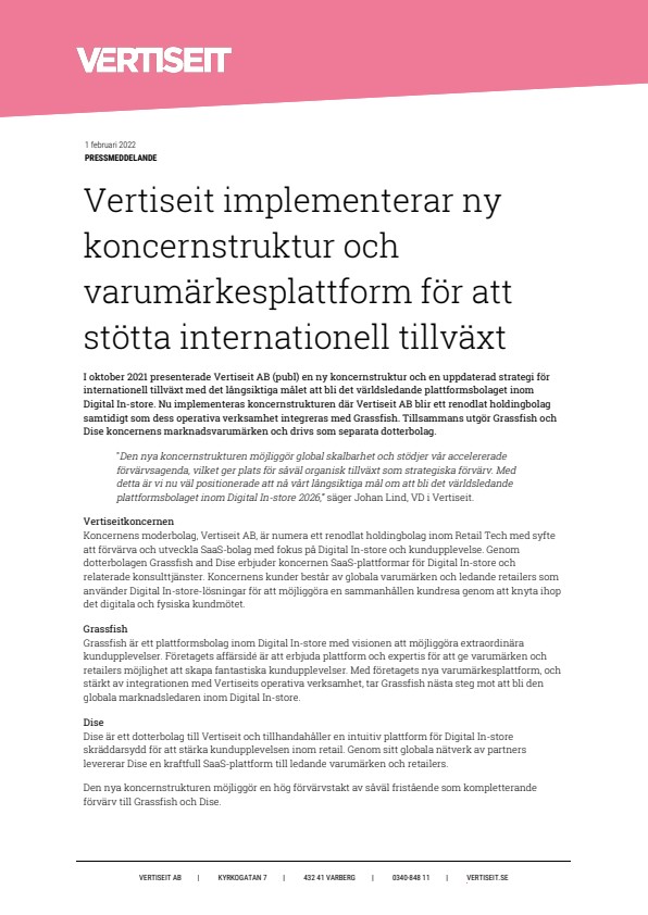 I oktober 2021 presenterade Vertiseit AB (publ) en ny koncernstruktur och en uppdaterad strategi för internationell tillväxt med det långsiktiga målet att bli det världsledande plattformsbolaget inom Digital In-store. Nu implementeras koncernstrukturen där Vertiseit AB blir ett renodlat holdingbolag samtidigt som dess operativa verksamhet integreras med Grassfish. Tillsammans utgör Grassfish och Dise koncernens marknadsvarumärken och drivs som separata dotterbolag.