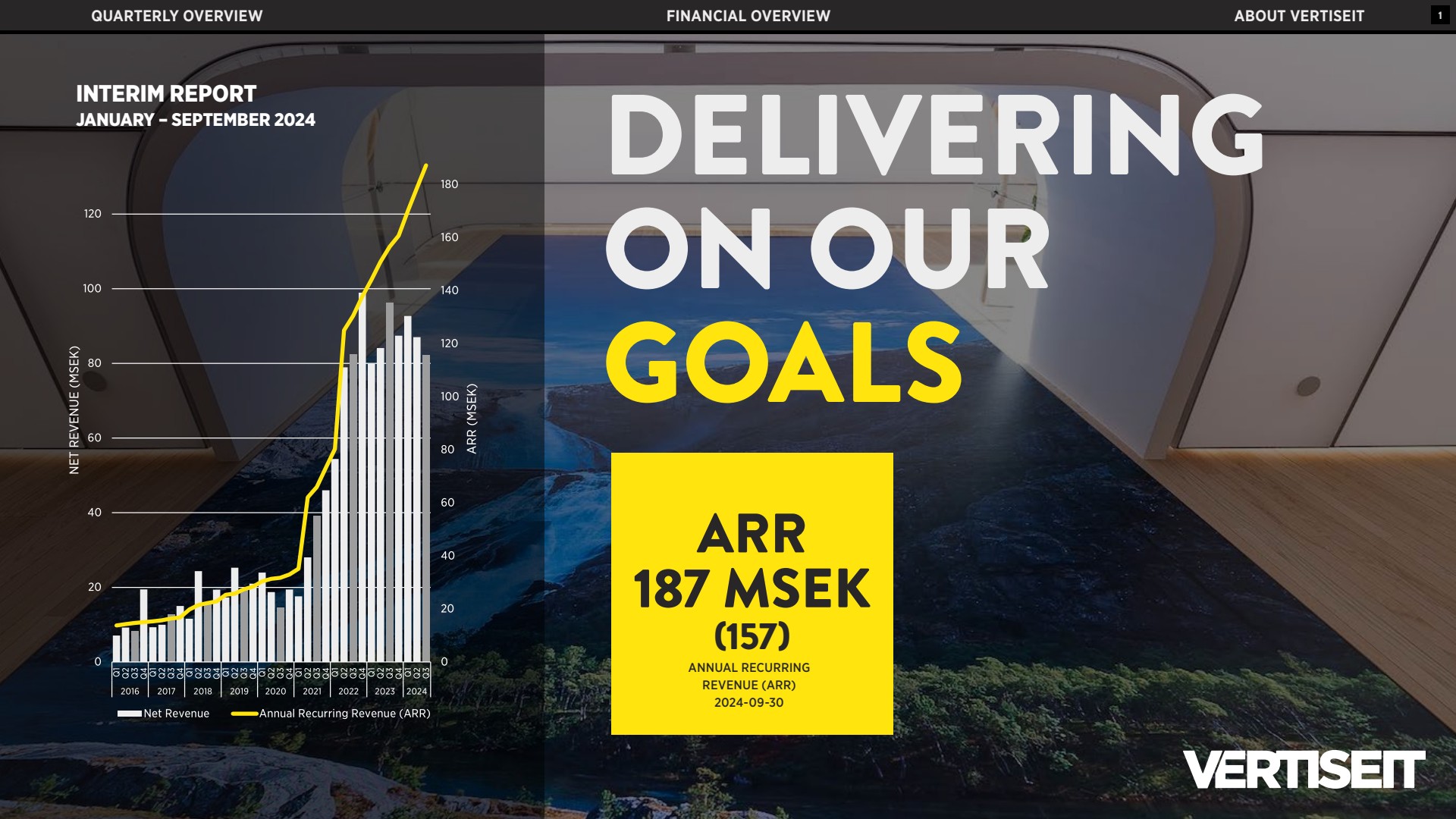 At the end of the third quarter of 2025, Vertiseit's ARR (Annual Recurring Revenue) amounted to 316.4 MSEK (187.2), an increase of 69.0 percent at constant exchange rates. SaaS revenue (Software as a Service) for the quarter increased by 26.7 MSEK to 73.1 MSEK (46.5). Sequentially, ARR grew organically by 2.6 percent compared to the previous quarter at constant exchange rates, corresponding to an annual organic growth rate of 10.9 percent. Net revenue increased by 83.6 percent to 150.7 MSEK (82.1). Adjusted EBITDA for the quarter amounted to 33.1 MSEK (23.2), corresponding to an adjusted EBITDA margin of 22.0 percent (28.2). Free cash flow for the quarter amounted to -10.1 MSEK (5.7).