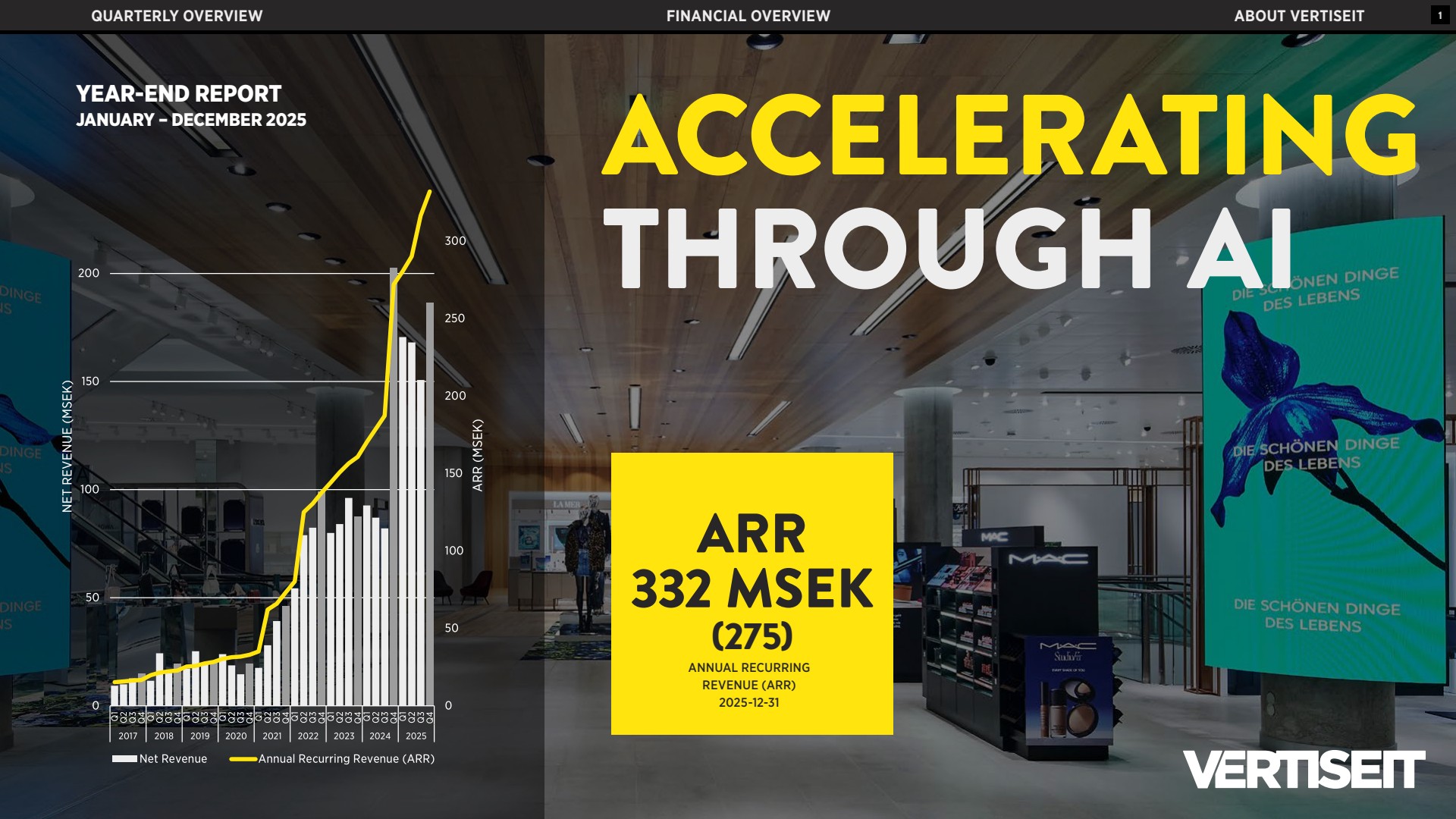 At the end of the fourth quarter of 2025, Vertiseit's ARR (Annual Recurring Revenue) amounted to 332.0 MSEK (275.0), an increase of 26.6 percent at constant exchange rates, of which 15.6 percent was organic growth. SaaS revenue (Software as a Service) for the quarter increased by 14.8 MSEK to 85.8 MSEK (71.0). Sequentially, ARR grew organically by 2.8 percent compared to the previous quarter at constant exchange rates, corresponding to an annual organic growth rate of 11.8 percent. Net revenue decreased by 8.1 percent to 186.3 MSEK (202.8) driven by a change in revenue mix, in line with the company’s strategy. Adjusted EBITDA for the quarter amounted to 33.1 MSEK (32.9), corresponding to an adjusted EBITDA margin of 17.8 percent (16.2). Free cash flow for the quarter amounted to -1.3 MSEK (3.1).